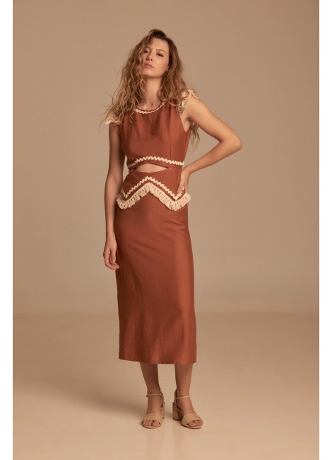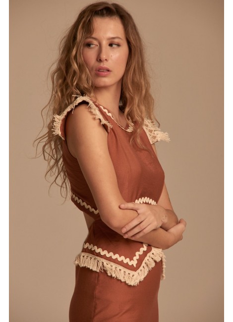 La joya de la corona, Alía es un vestido súper especial con detalles que lo hacen único, nos encanta como opción perfecta para vestir cualquier evento, con piculinas y flecos en color natural y una pieza étnica acabada en fleco también a modo de hombrera.