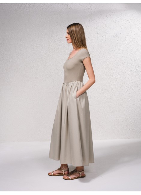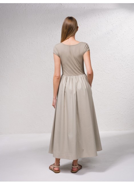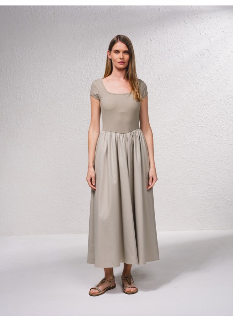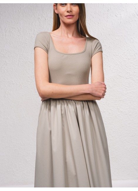 Vestido midi, falda amplia con fruncido en cintura, top entallado de manga corta y escote cuadrado.