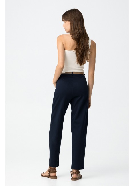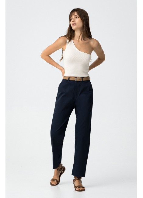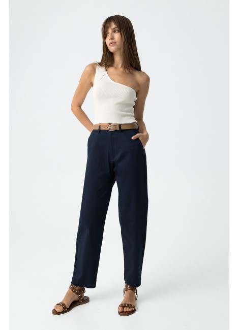 Pantalón de tiro medio con cinturón efecto piel. Cierre frontal con cremallera y gancho metálico. Bolsillos laterales.