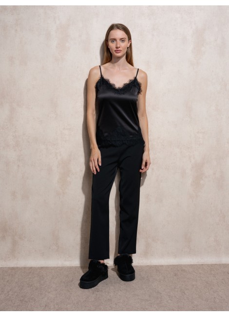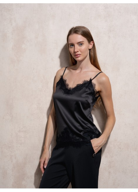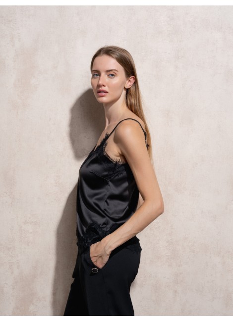 Top de satén estilo lencería con escote en V y tirantes finos ajustables. Detalle de encaje del mismo tono.