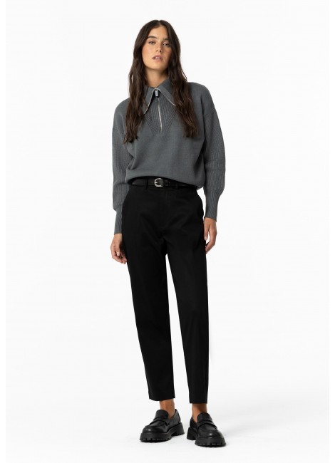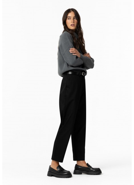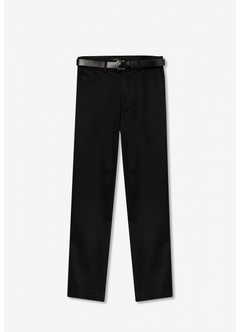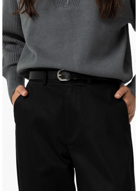 Pantalón de tiro medio con cinturón efecto piel. Cierre frontal con cremallera y gancho metálico. Bolsillos laterales.