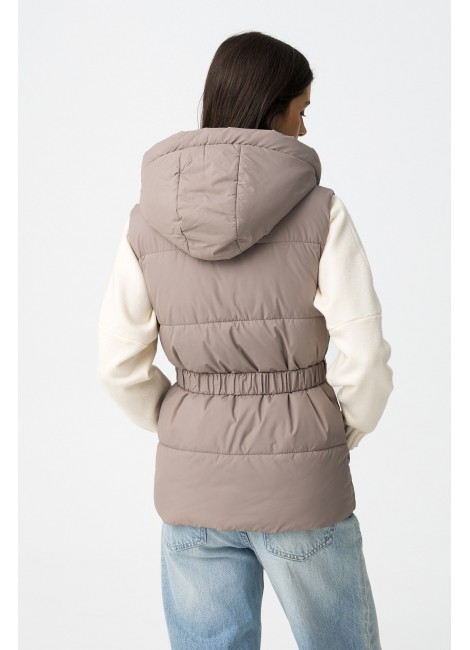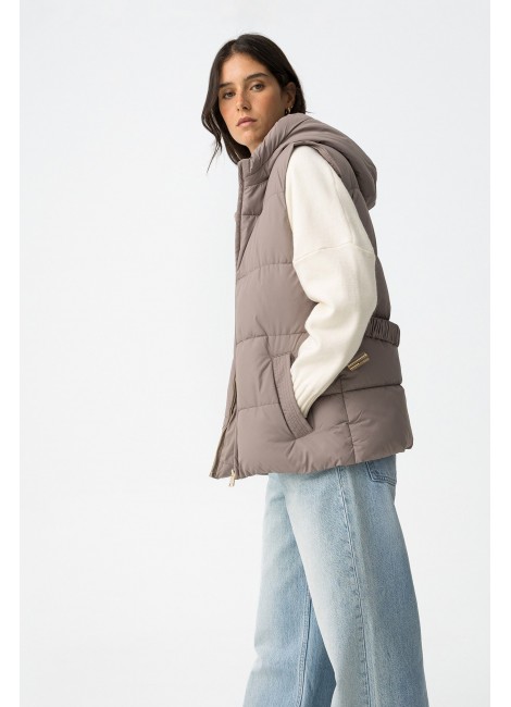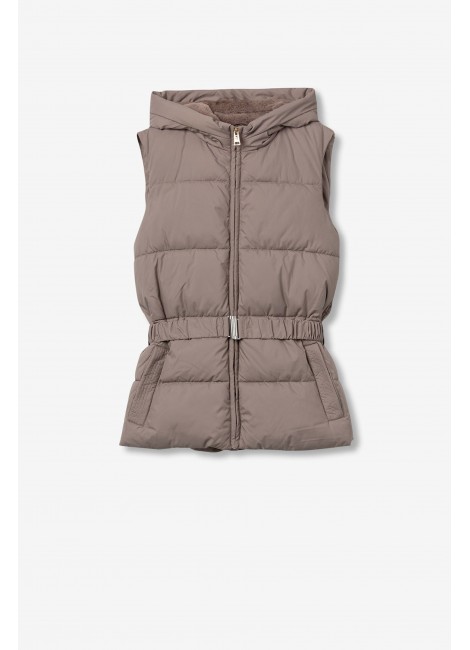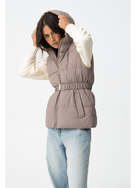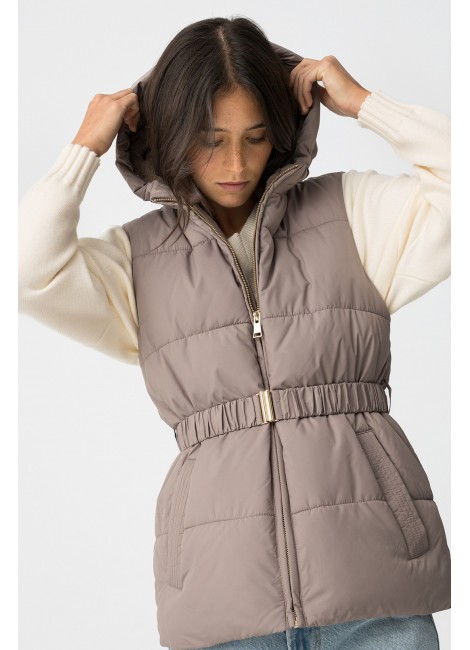 Chaleco acolchado regular fit, con cinturón elástico removible, dos bolsillos frontales, capucha, manga sisa y cierre frontal con cremallera.