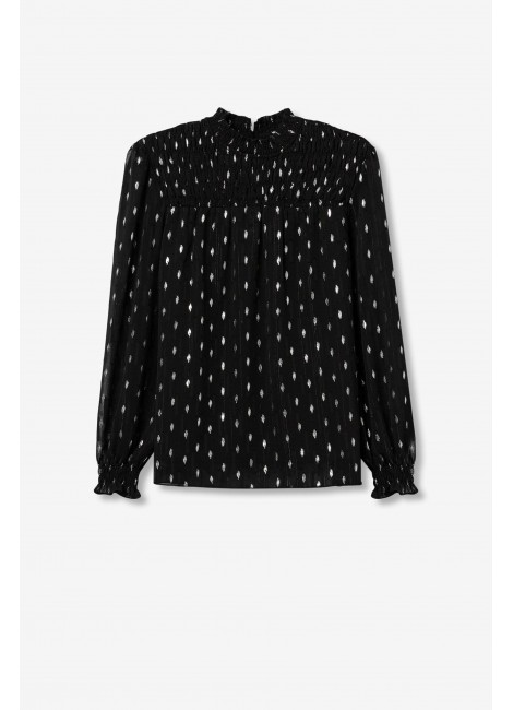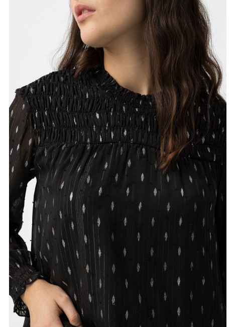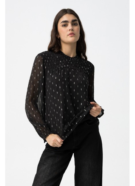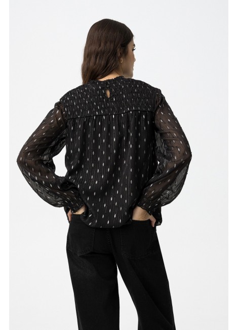 Blusa regular fit semitransparente con drapeado, textura, estampado metálico e hilo metálico insertado. Cuello redondo con volante, manga larga con elástico y volante en los puños. Cierre de botón trasero.