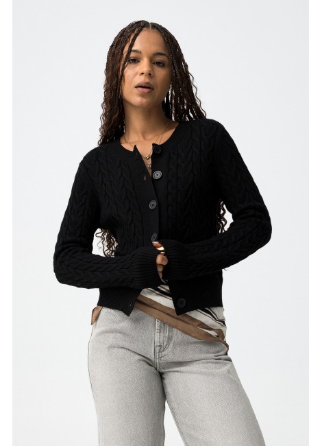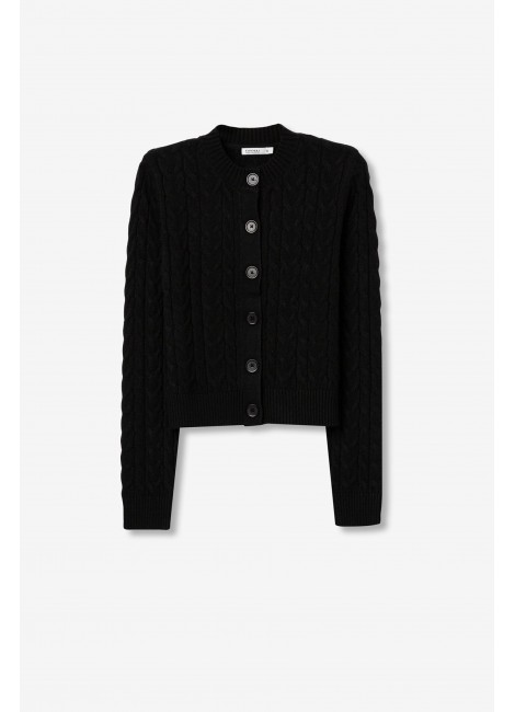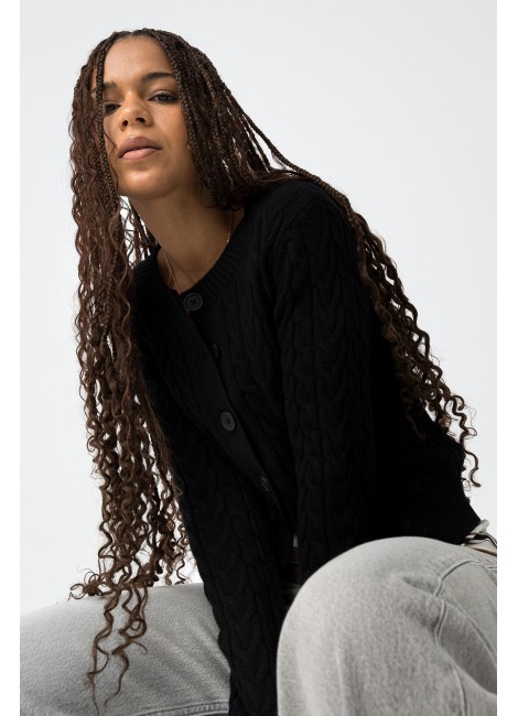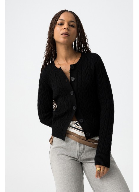 Cárdigan slim fit de punto trenzado con cierre frontal de botones, cuello redondo y manga larga.