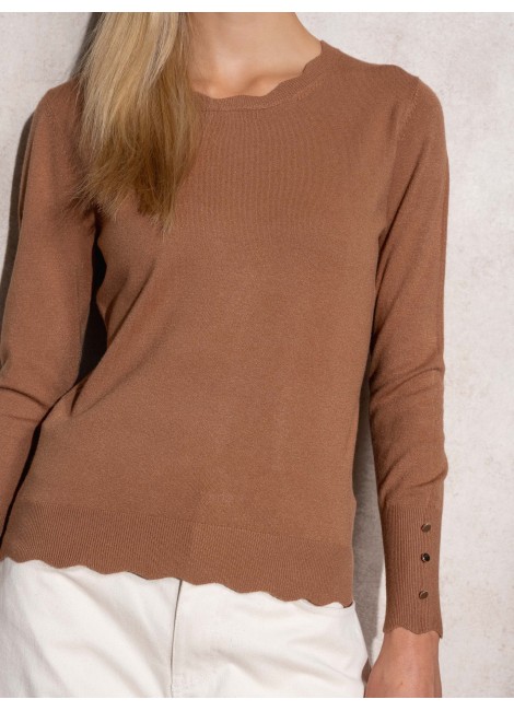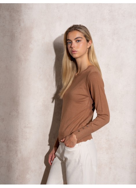 Suéter con cuello redondo y manga larga. Detalle de botones dorados en los puños. Ribete de canalé.