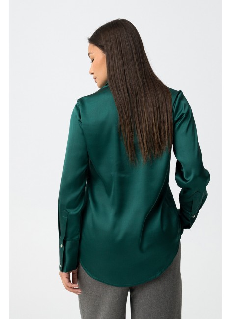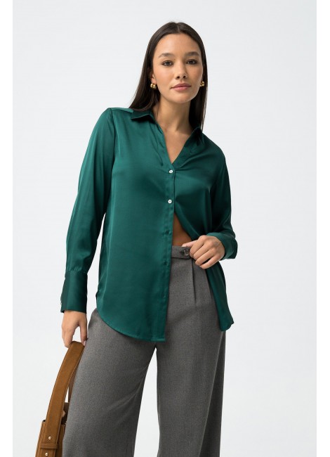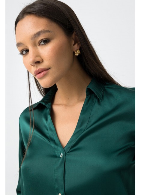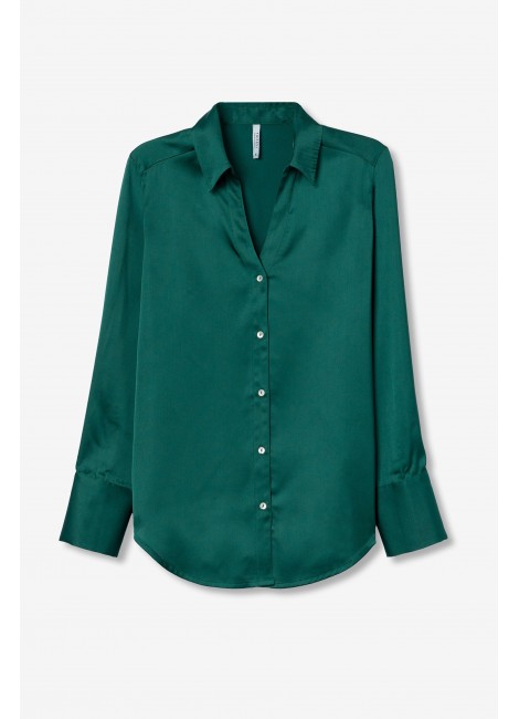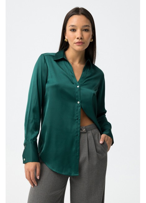 Camisa satinada de corte regular y lisa. Escote en V con cuello, cierre de botones y manga larga con puños abotonados.