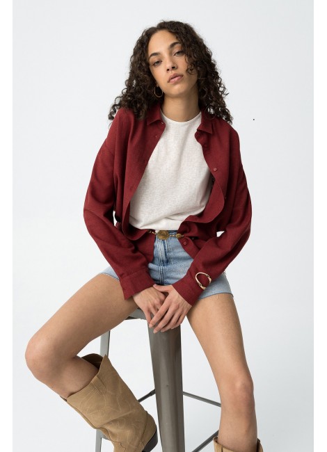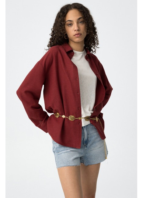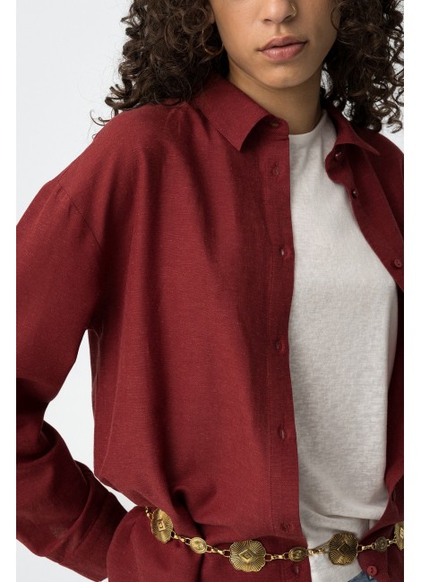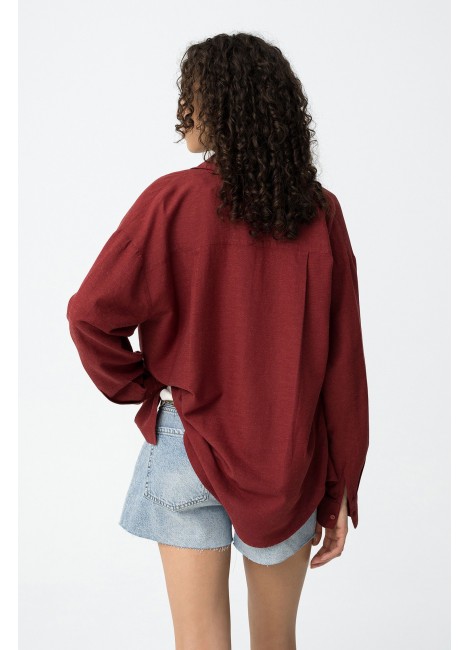 Camisa relaxed fit en tono burdeos, con cuello clásico y manga larga, confeccionada en lino