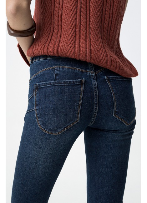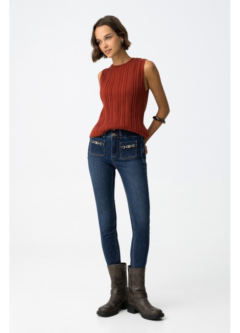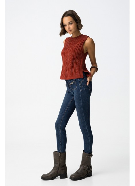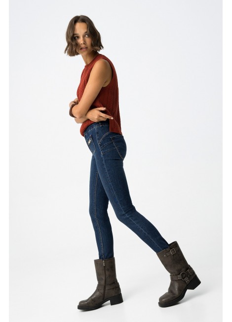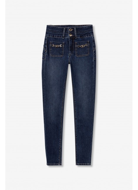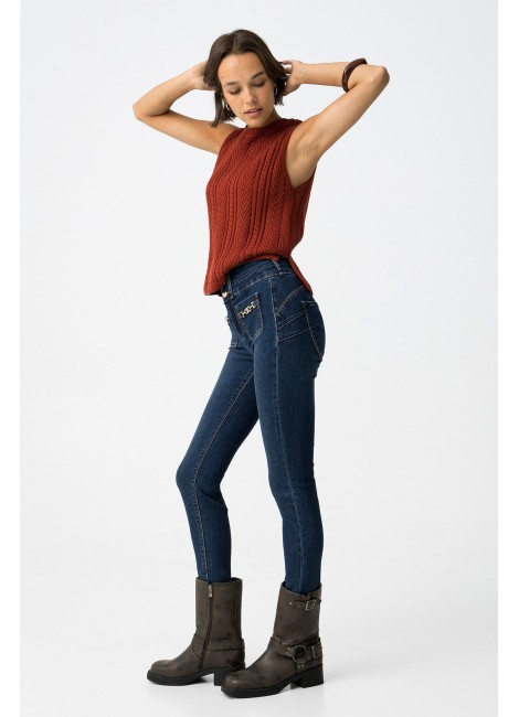 Vaqueros Double-up con cintura alta, pernera skinny, cuatro bolsillos y hebillas decorativas. Cierre frontal con cremallera y botones metálicos. Bajo cropped.