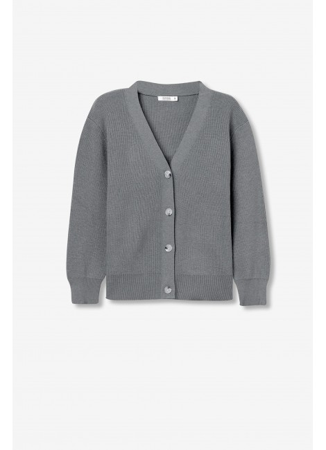 Cárdigan regular fit con abertura frontal y cierre de botones. Escote en V y manga larga.