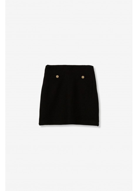 Falda corta de cintura alta en negro con botones decorativos y textura de punto elegante.