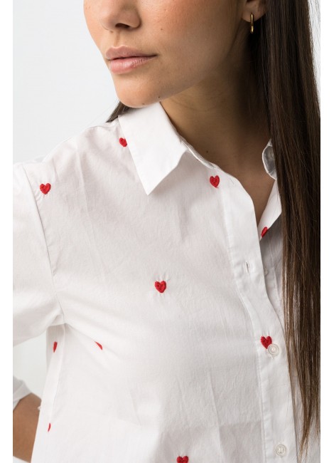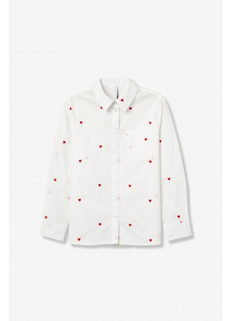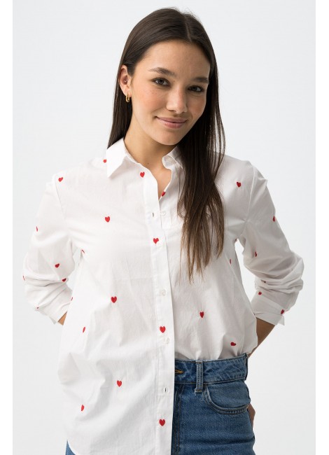 Camisa blanca de manga larga con estampado de pequeños corazones rojos, corte regular y clásico.