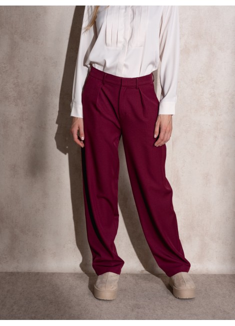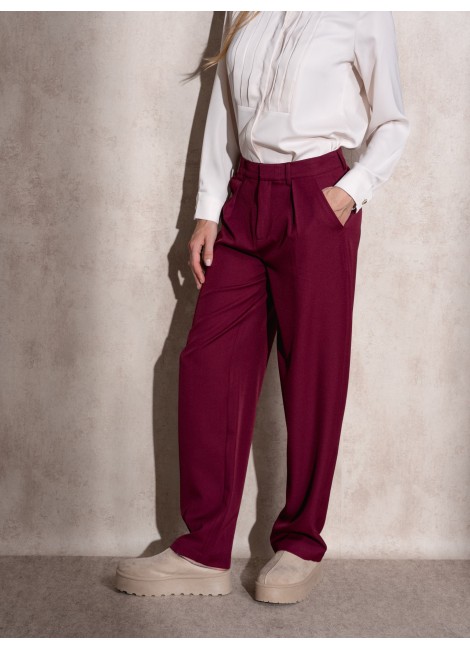 Pantalones de cintura alta. Bolsillos delanteros con ribete. Cierre frontal con cremallera y gancho metálico.
